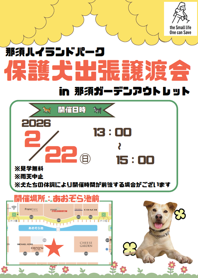 那須ハイランドパークにて行っている保護犬の譲渡活動が那須ガーデンアウトレットにて出張譲渡会を開催します。