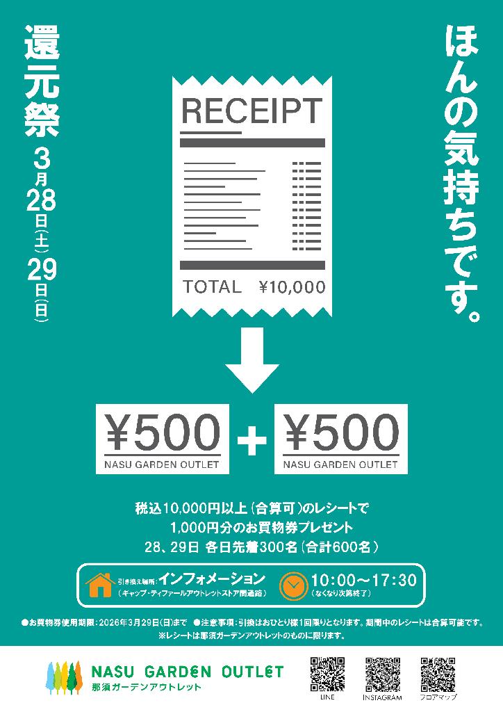 館内で 税込10,000円以上(合算可)お買い上げのレシート をご提示いただくと、