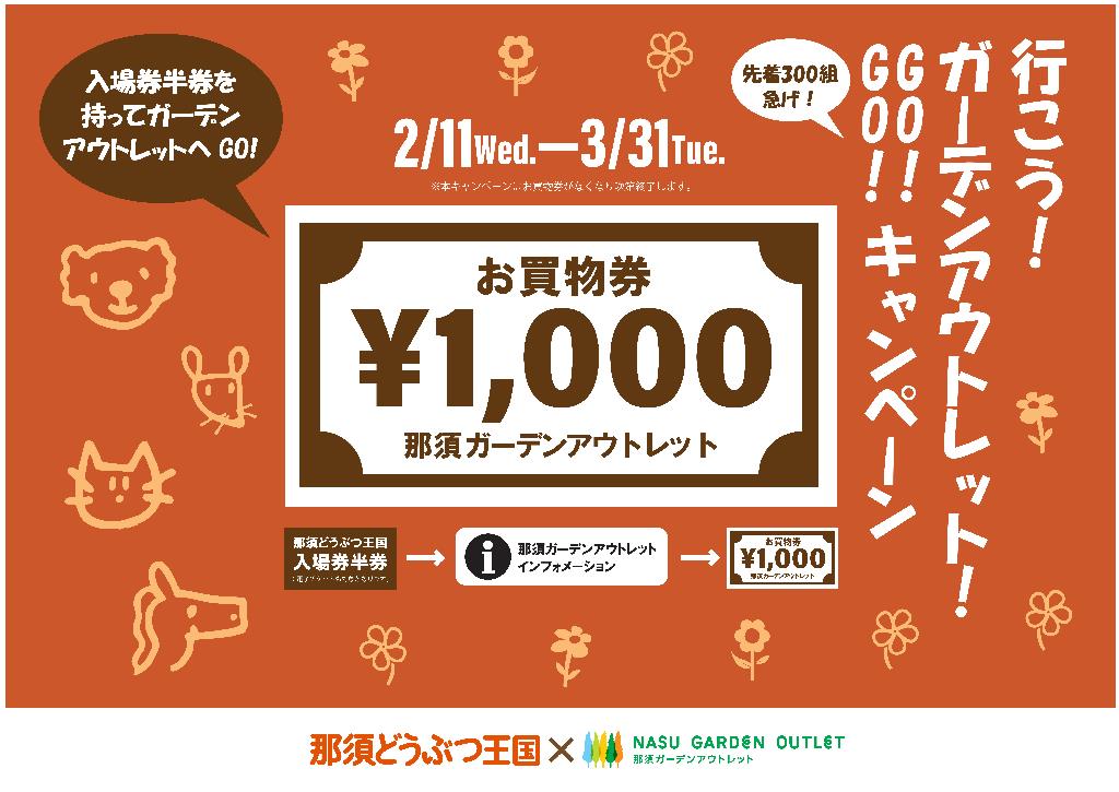 那須どうぶつ王国の入場券半券をご提示(※電子チケットも対象となります)で那須ガーデンアウトレットでご利用いただける1000円お買物券プレゼント!(1グループあたり1枚)