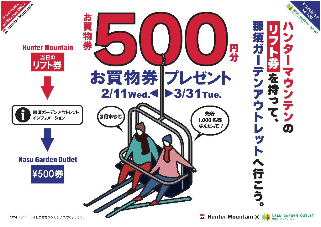 今シーズンのハンターマウンテンのリフト券をご提示で那須ガーデンアウトレットでご利用いただける500円お買物券プレゼント!