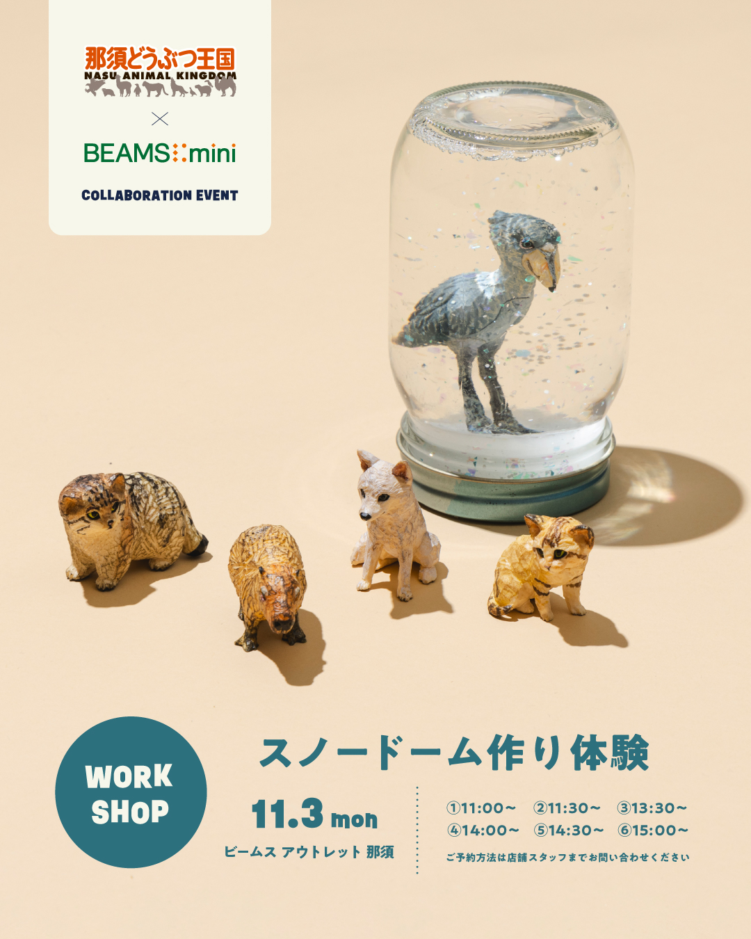 ビームス アウトレット 那須では、彫刻家のはしもとみお氏が那須どうぶつ王国のために作成した細部まで作り込まれたフィギュアを使った、スノードーム作りワークショップを開催いたします!