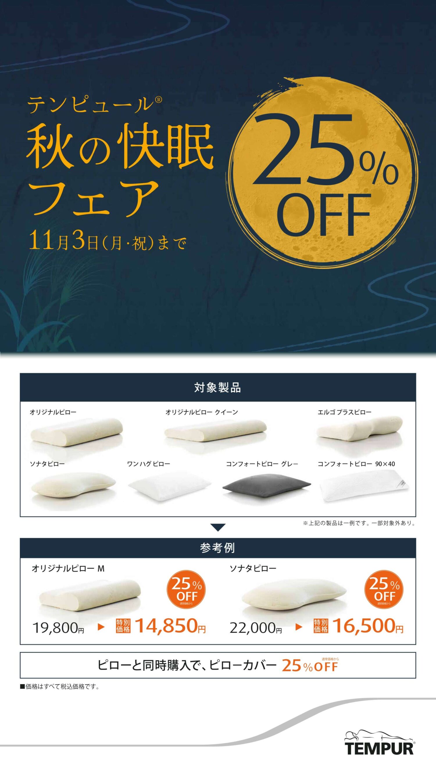 2025.10.28ライフスタイルグッズ&サービスピロー25%OFF期間: 2025.10.28〜2025.11.03只今秋の快眠フェアを開催中人気のピローが25%OFFとお買い得です。皆様のご来店をお待ちしております。テンピュールノースエリア 007ライフスタイルグッズ&サービス / 寝具Tel.0287-65-0807SHOP INFO