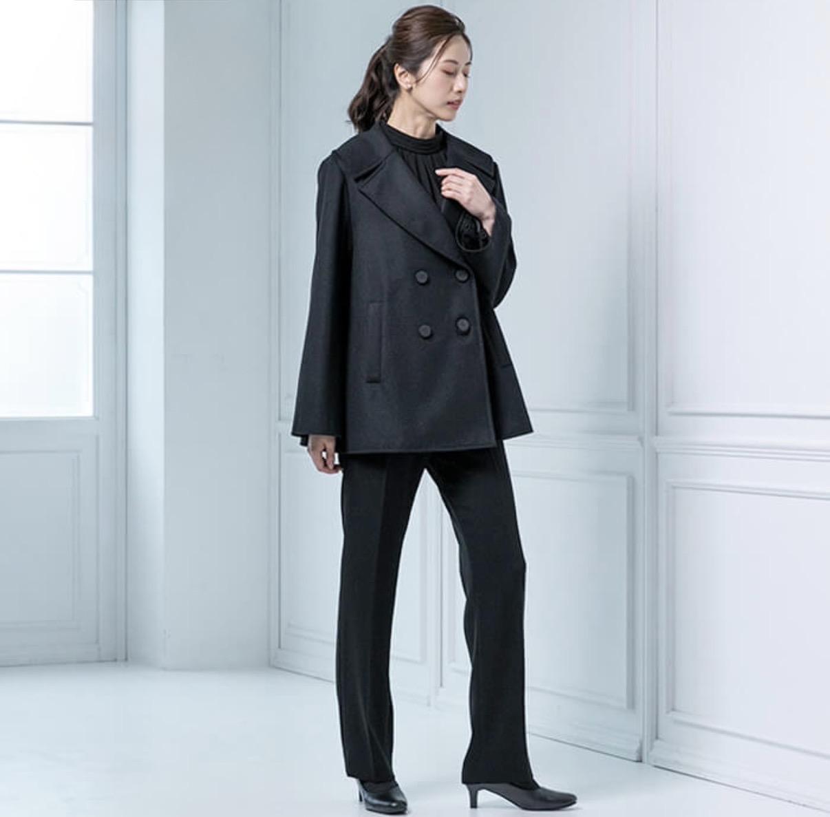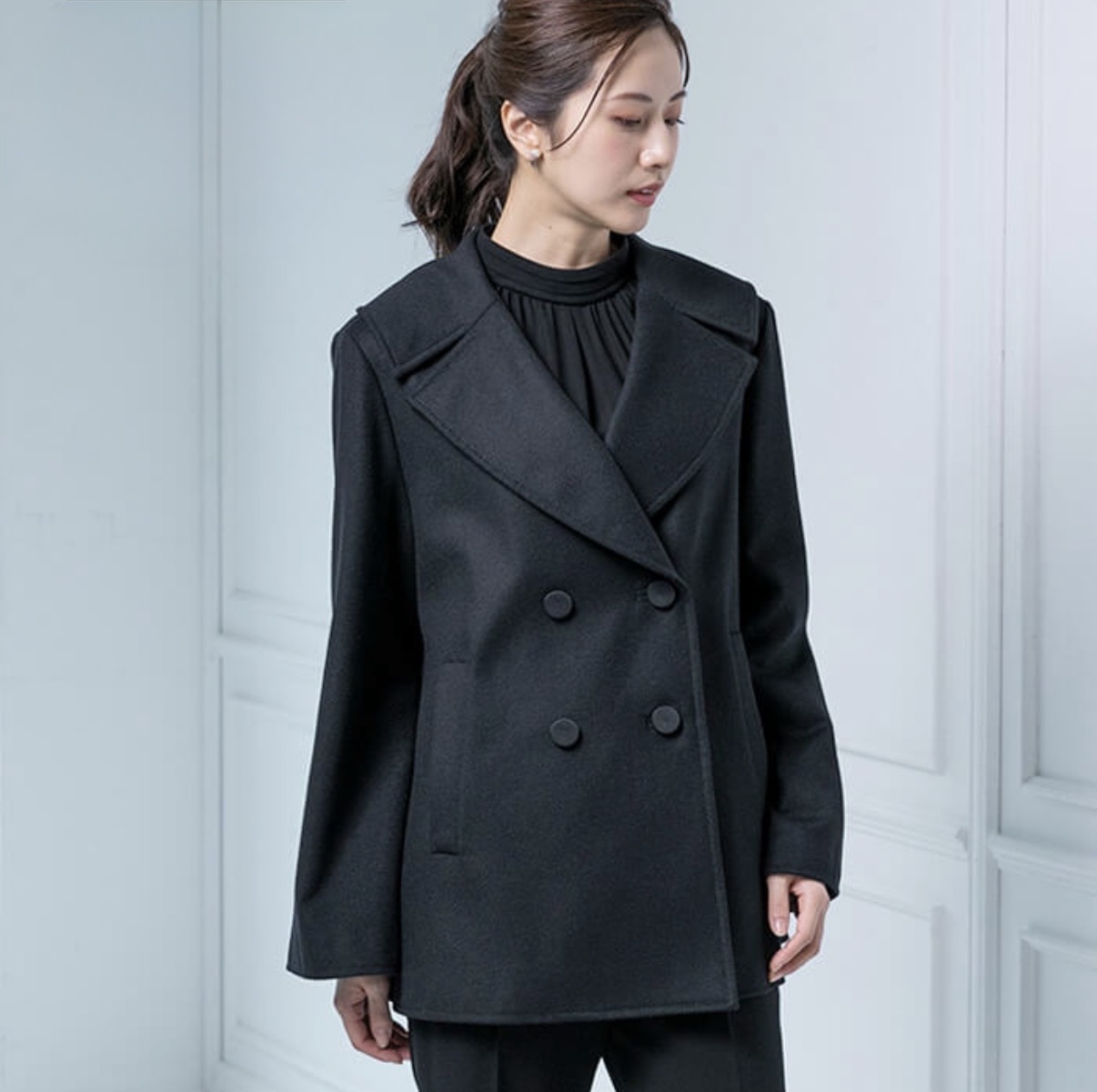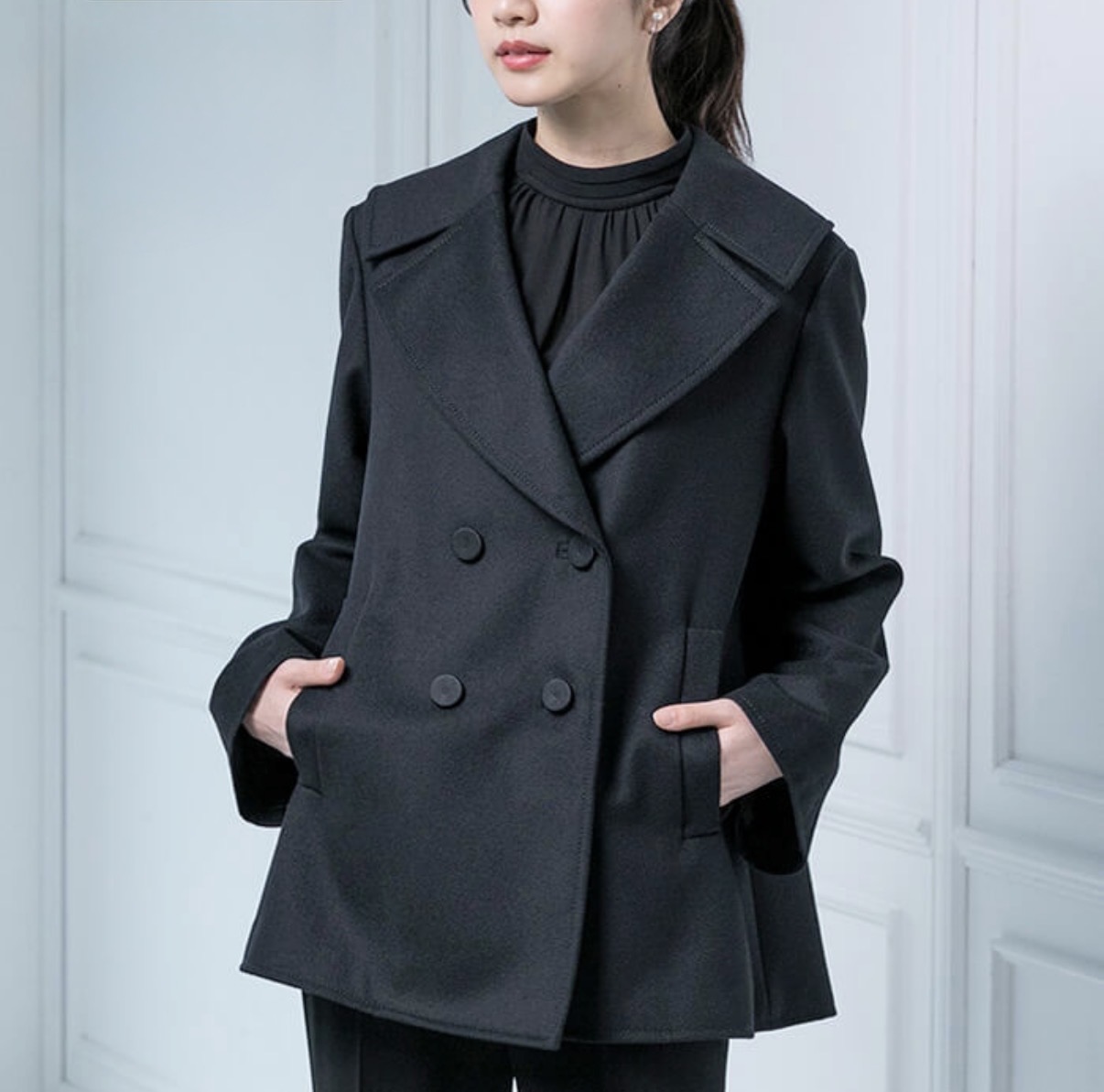 上質なカシミヤ混ウールで仕立てたハーフ丈のピーコート。