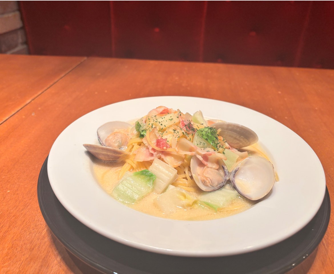 【冬の限定商品】ハマグリとベーコン、白菜のチャウダー風豆乳スープパスタ