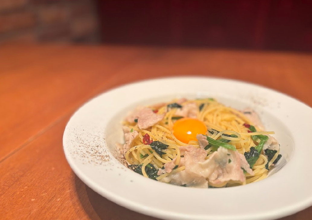 とちぎ夢ポークとほうれん草のシンプルなペペロンチーノに卵黄をのせ、濃厚さをプラスしました。