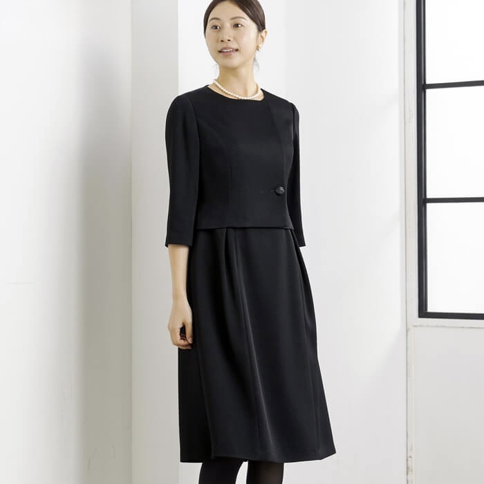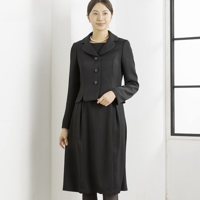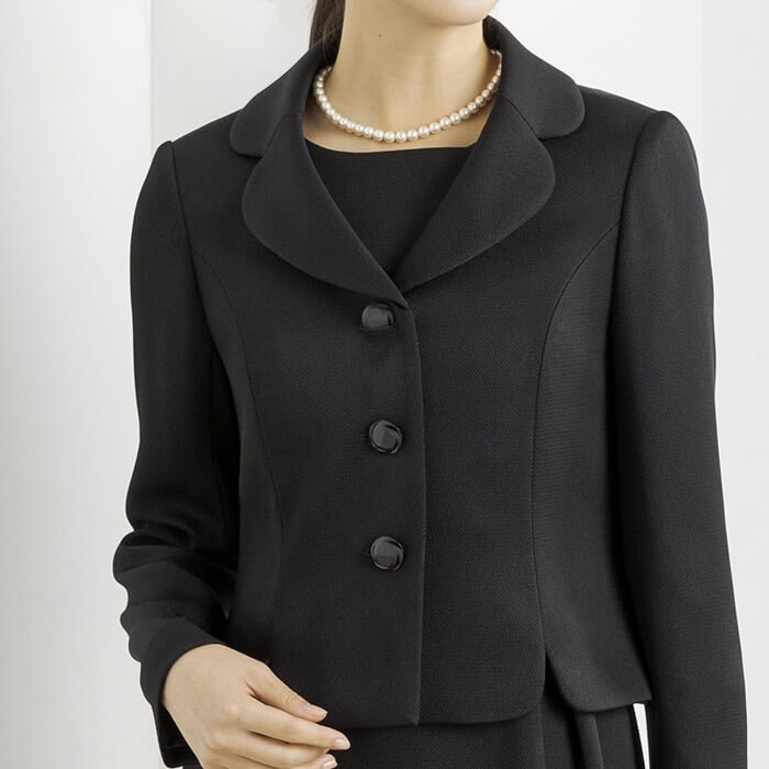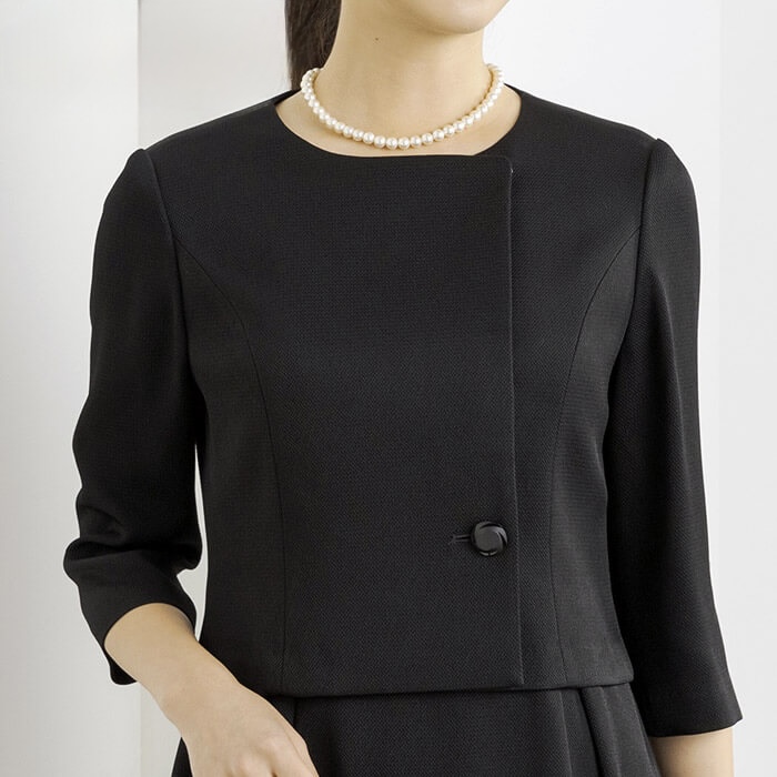 立体的なテーラードジャケットと、スーツ風に見えるトリックワンピースのセットアップ。 クラシカルな1着です。 上品な光沢感のあるオプティカルフラワージャカードは、喪服としても安心な濃染加工の漆黒。 オールシーズン対応の中肉素材で、アクセサリーを添えて式服・礼服として着まわせます。 きちんと感のあるテーラードは教職員の方の式服にもおすすめです。
