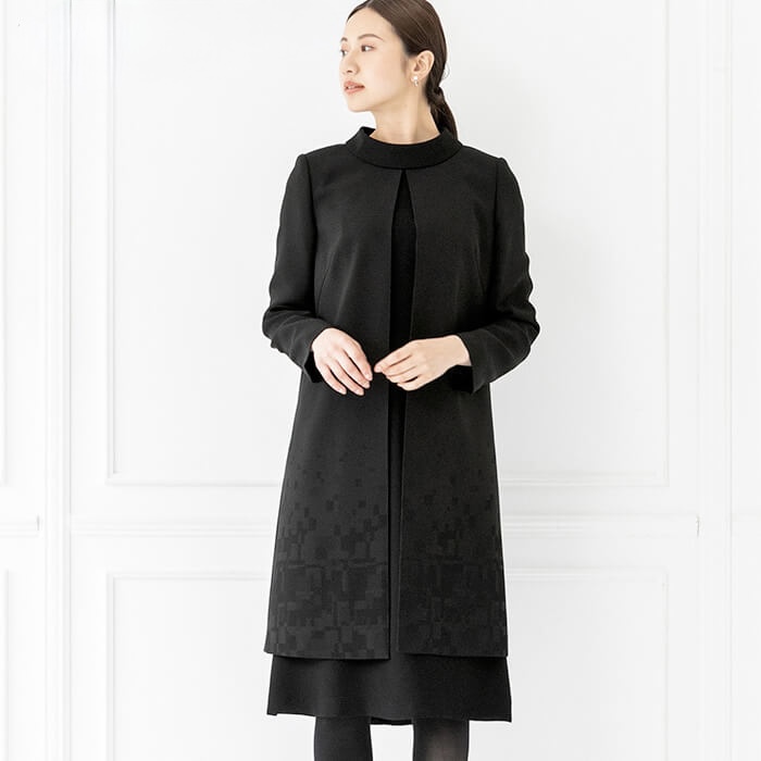 人気デザイナーズブランド 幾何柄ジャカードがポイントのロングジャケットとロールカラーワンピースのアンサンブル