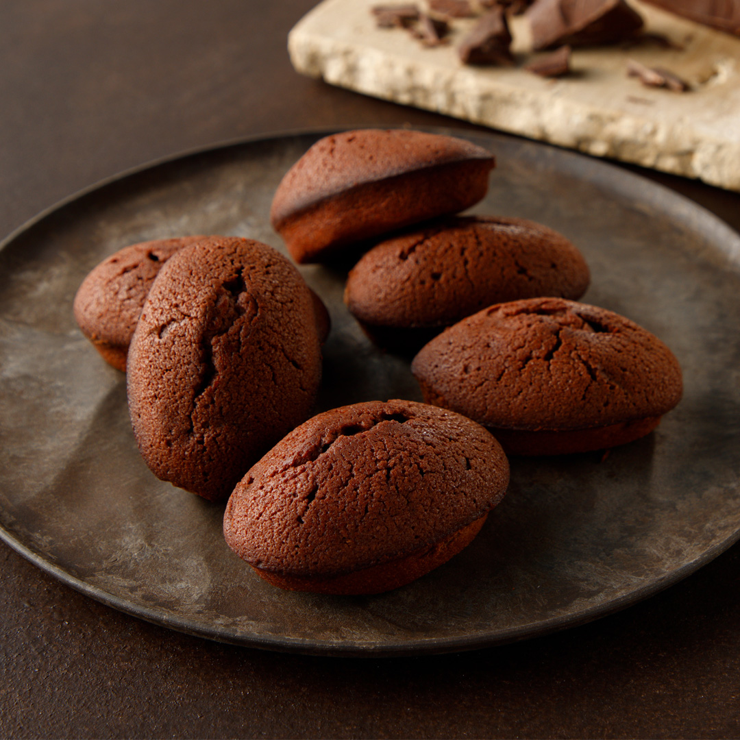 芳醇なバターが香るフィナンシェ生地に、華やかな香りの風味豊かなチョコレートをあわせて、しっとりと焼き上げました。