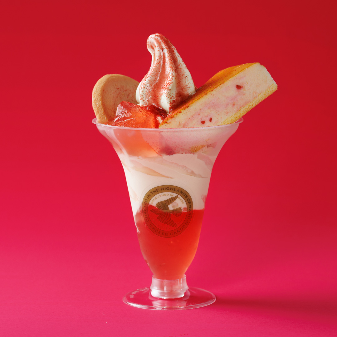 苺の華やかな甘い味わいとチーズケーキソフトのコクが楽しめる、季節限定のパフェです