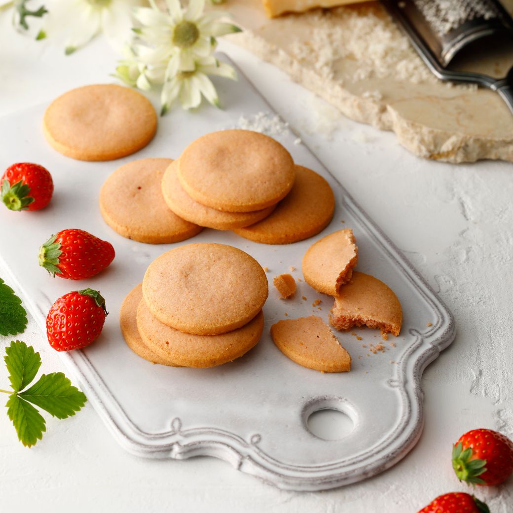 コクのある濃厚なパルメザンチーズを使用した生地に、甘酸っぱい苺ペーストなどをあわせてサクサク食感に仕上げた、季節限定のチーズクッキーです。