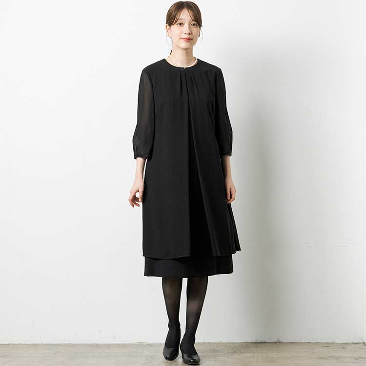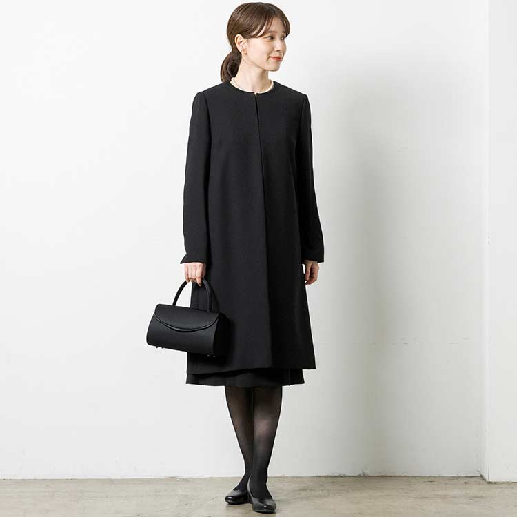 人気のロングジャケットとスタイルカバー効果のある前開きワンピースのセットアップ。 オールシーズン対応の、喪服として安心な濃染加工による漆黒の生地を使用しています。 人気のロングジャケットは、後中心のボックスプリーツがアクセント。 両側にポケットがついています。 ワンピースは、ノースリーブにロングジャケットを羽織ったような一枚仕立てのトリックワンピース。 左胸にファスナーがある前開きです。 背中部分は通気性の良い夏用の裏地を使用しています。