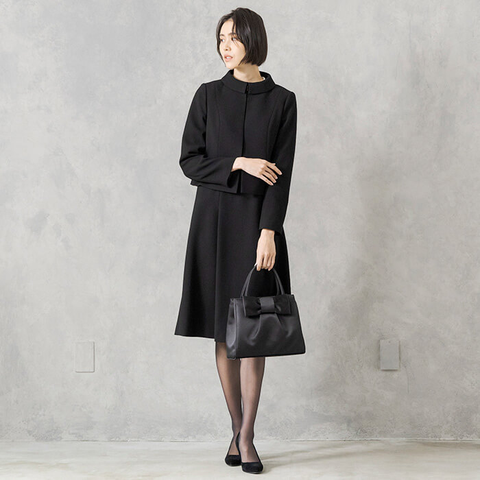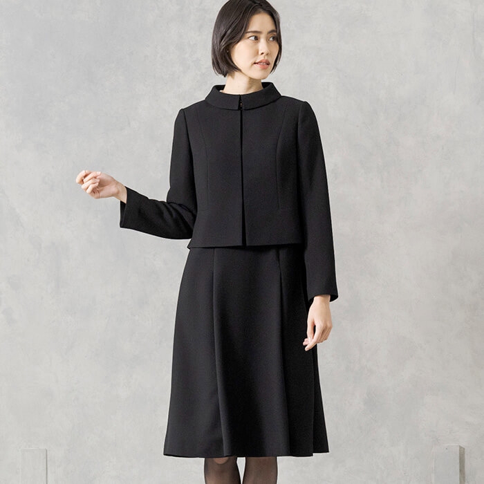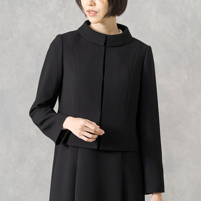 上品で優しい印象のショールカラーがポイント。ワンピースは、オフボディシルエットで身体のラインを拾わないデザイン。フロントにファスナーがついているので、楽に着脱が可能です。きちんと感のあるアンサンブルは、シンプルなデザインで長い期間着用する喪服をお求めの方におすすめです。