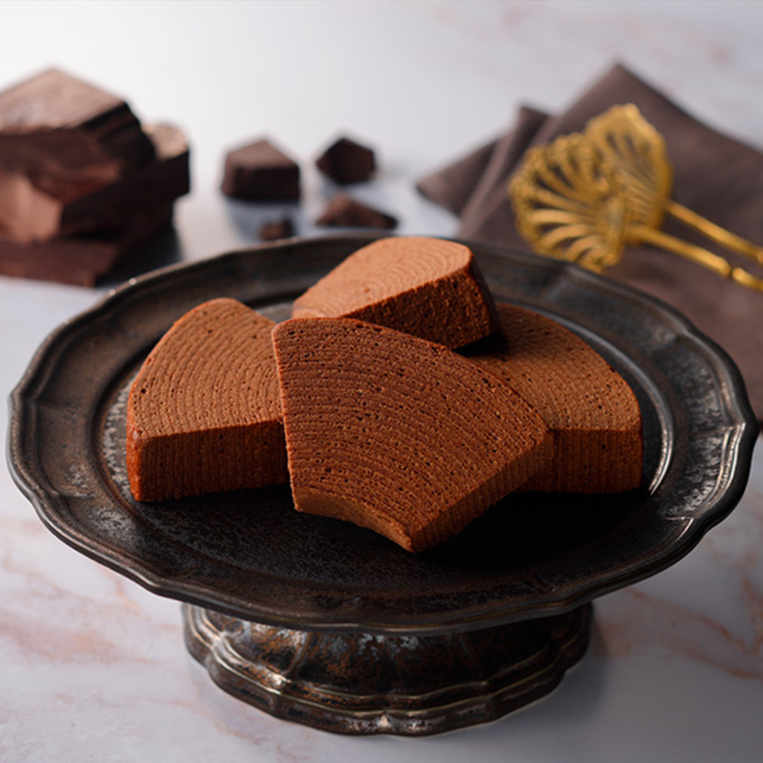 カカオの香りと心地よいビター感、そしてチーズの豊かな味わいがひろがるバウムクーヘンです。