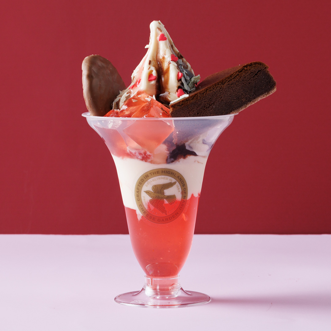 甘い香りと味わいが特長の栃木県産「とちあいか」を使用した苺ゼリーに、ベイクドチーズケーキ風味のチーズケーキソフトを重ねて季節限定のクッキーやチーズケーキをトッピングしたこの時期ならではの味わいです。