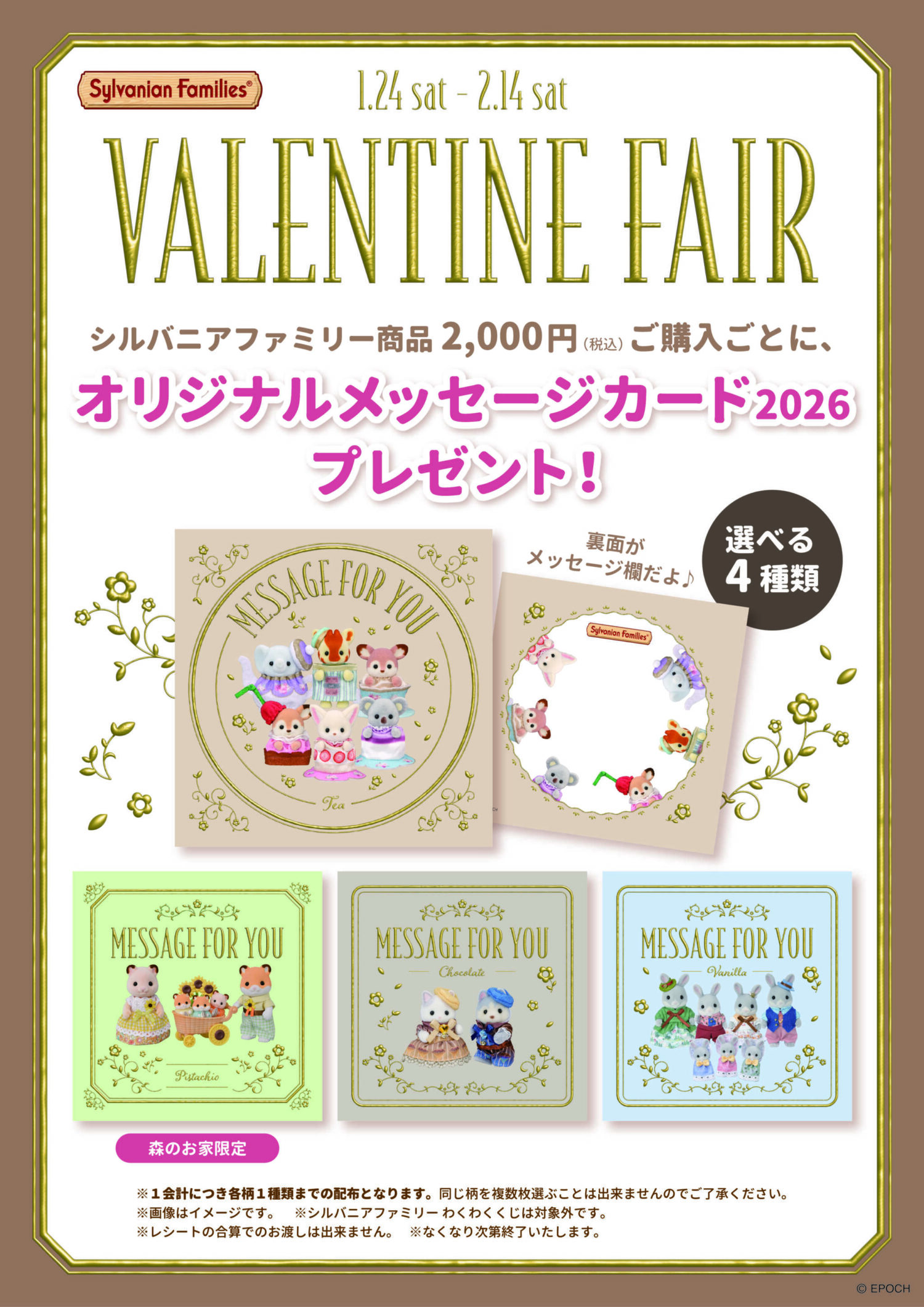 2026.01.24ライフスタイルグッズ&サービス❁・❁ VALENTINE FAIR ❁・❁期間中のお買い物で、オリジナルメッセージカードを1枚プレゼントします! ギフトに添えても、自分でかざってもかわいいカードが全4種類♪さらに他の店舗でもらえる絵柄もあるので、ぜひチェックしてみてくださいね♪シルバニアファミリー 森のお家/ジグソーパズルのお店 マスターピースサウスエリア 231ライフスタイルグッズ&サービス / 玩具、ジグソーパズルTel.0287-74-3040SHOP INFO
