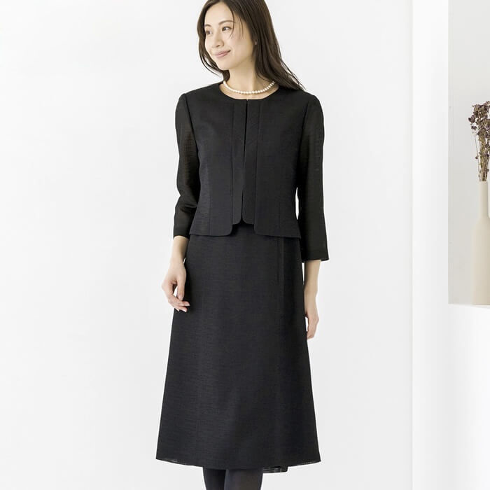 ブランドアイコンであるチェック柄を絡み織のように織り上げた素材。濃染加工の漆黒。ジャケットは暑い季節にもさらっと織れる軽やかな仕立て。セットアップ風に見えるワンピースは、前にファスナーがある 1枚仕立てのトリック式。季節の変わり目や、空調の厳しい盛夏の行事にも使いやすい正統派のアンサンブル。