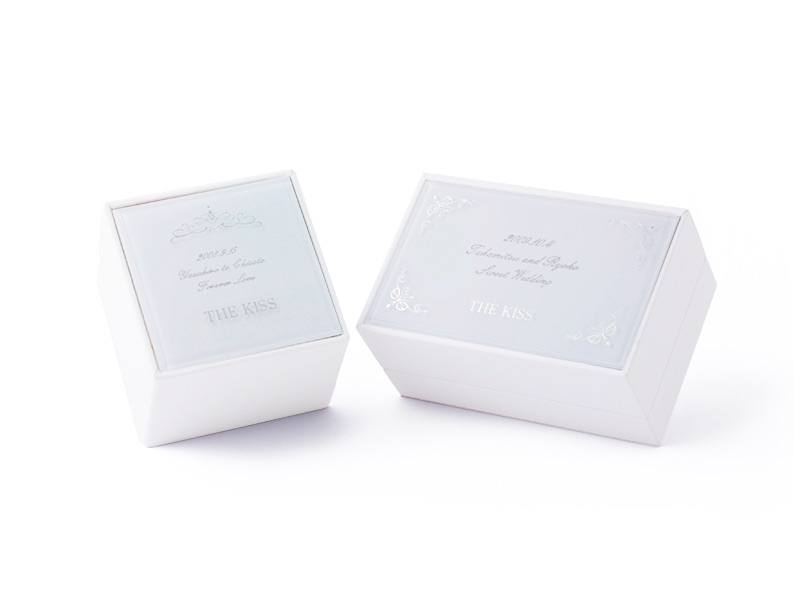 専用のジュエリーボックスに、おふたりの記念日やお名前、メッセージ(3種類から選択)を刻印するサービスをご用意しています。