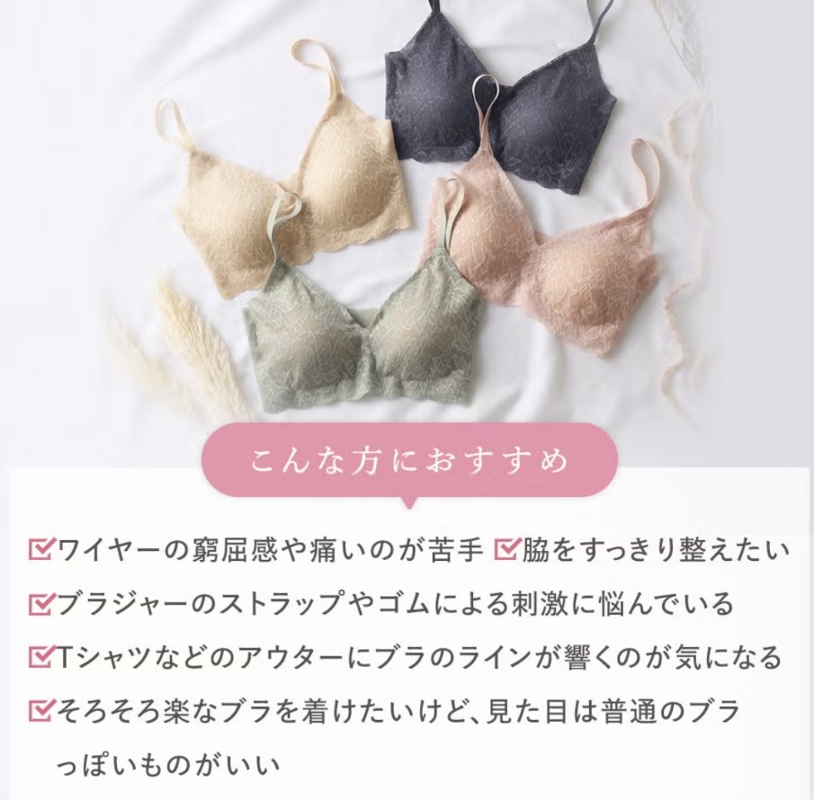 ノンワイヤーで締めつけにくく、快適な着け心地です。