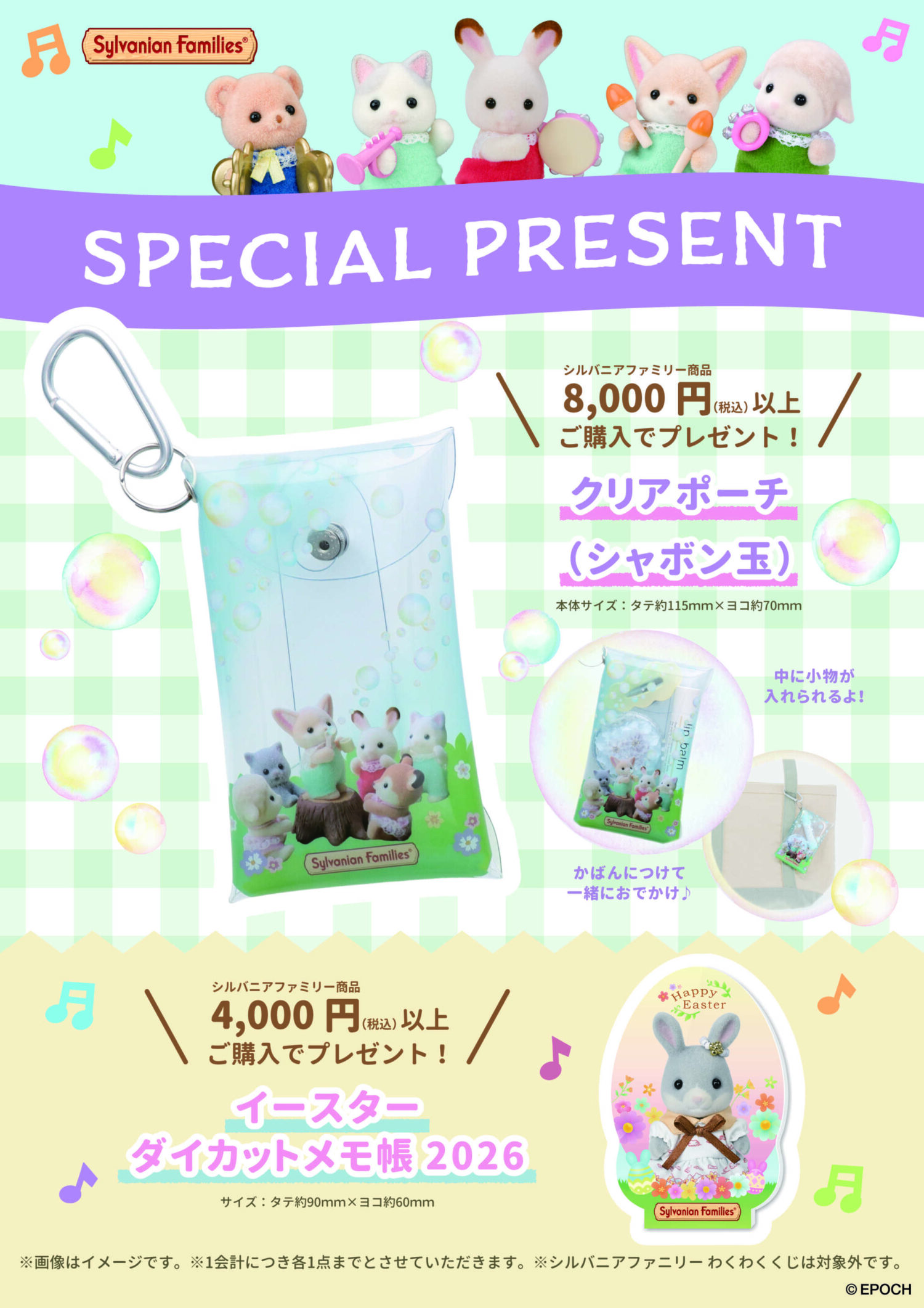 シルバニアファミリー商品4,000円(税込)以上のご購入で「ダイカットメモ帳(わたウサギ)」、8,000円(税込)以上のご購入で「クリアポーチ(シャボン玉)」をおひとつプレゼントいたします。